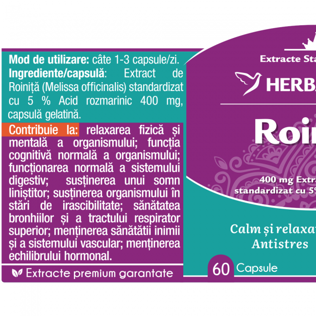 Produsul Roiniță Melissa are o concentrație ridicată de Roiniță cu 400 mg extract/capsulă. Este un extract cu standardizare ridicată, iar fiecare capsulă garantează un aport de 5% Acid Rozmarinic, compus activ care asigură relaxarea sistemului nervos și combaterea stărilor de stres și anxietate.