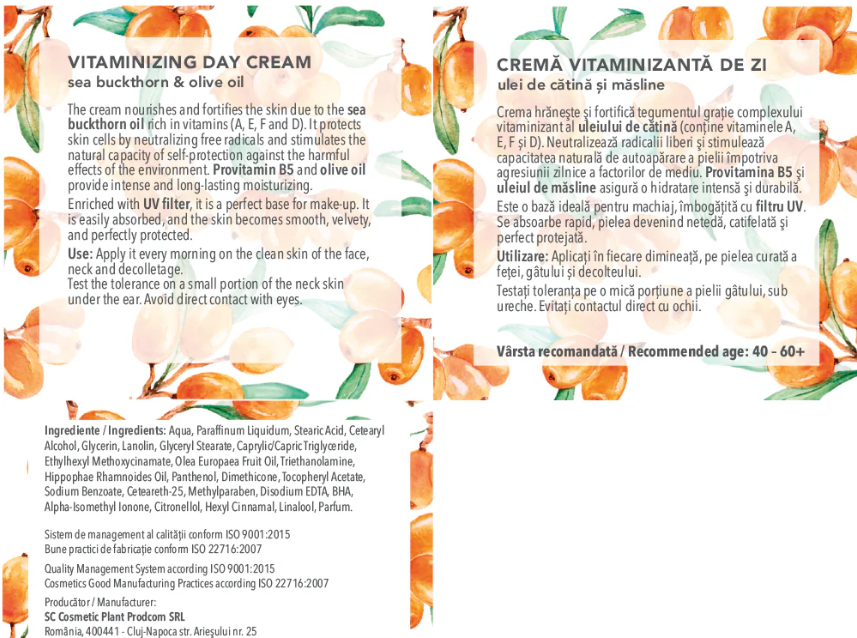 Crema vitaminizantă de zi hrăneşte şi fortifică tegumentul graţie complexului vitaminizant al uleiului de cătină (conține vitaminele A, E, F și D). Provitamina B5 şi uleiul de măsline asigură o hidratare intensă şi durabilă.