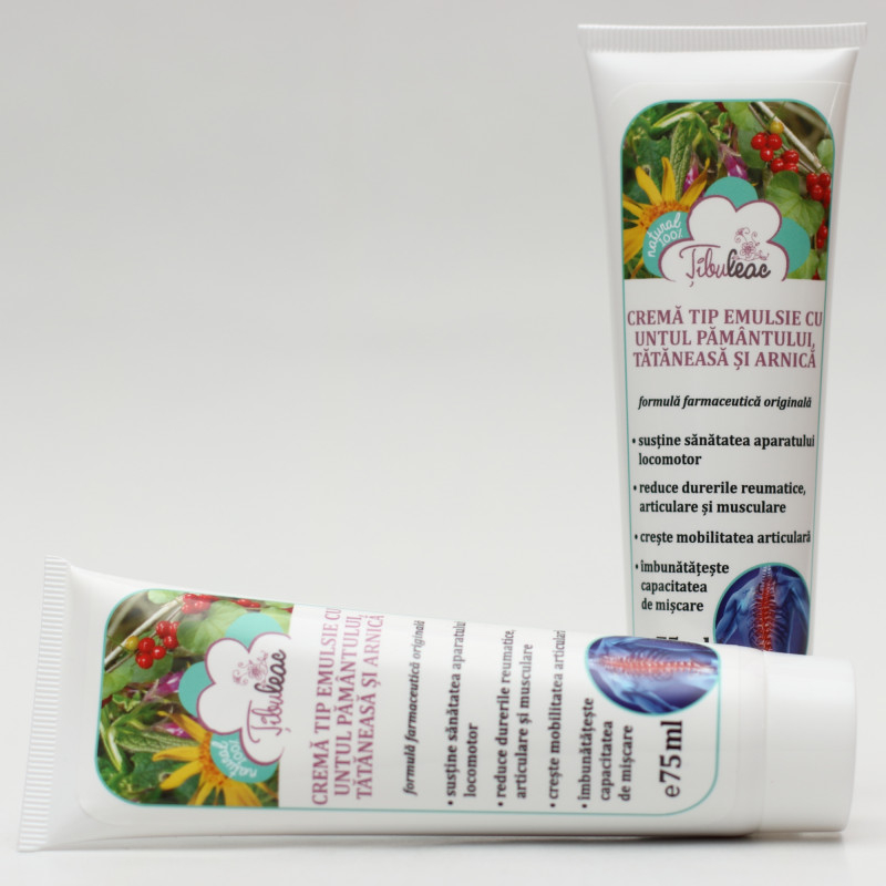 Crema tip emulsie cu Untul Pământului, Tătăneasă şi Arnică este o formulă complexă ce îmbină beneficiile plantelor medicinale, având proprietăţi benefice în reducerea durerilor articulare, reumatice şi musculare, totodată stimulând procesul de refacere a cartilajului articular şi a ţesuturilor moi, ajutând la îmbunătăţirea capacităţii de mişcare.