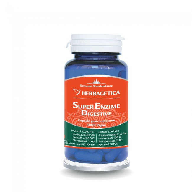 10 enzime digestive naturale vegane în concentrații mari/cps care asigură digestia oricărui tip de aliment: Amilază, Protează, Lactază, Lipază, Glucoamilază, Pectinază, Alfa galactozidază, Beta-glucanază, Hemicelulază, Celulază.