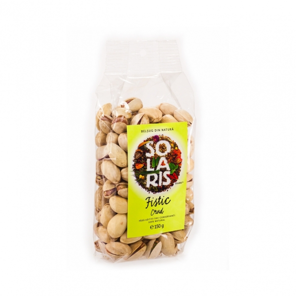 Fistic crud, 150 g, Solaris-Arbustul de fistic creste in Grecia, Siria, Turcia, Iran, Pakistan s.a. Contine:Bogat in proteine, minerale (calciu, potasiu, fosfor, magneziu), grasimi nesaturate vegetale. Actiune: Ofera senzatie de satietate de durata, cu un continut de 20% proteina. Continutul mare de magneziu diminueaza aparitia migrenelor si poate reduce tensiunea arteriala. Pentru sistemul osos si dantura este recomandat prin continutul sau bogat in fosfor Fisticul crud consumat zilnic scade factorul de risc al afectiunilor cardiovasculare si a accidentelor cerebrale. Fisticul crudeste o sursa importanta de energie datorita continutului ridicat in substante nutritive. Cum se consuma: Poate fi consumat ca atare, prajit si sarat (cu sare fara adaos de iod), maruntit si presarat peste inghetate, tarte cu creme usoare, ciocolata neagra s.a.