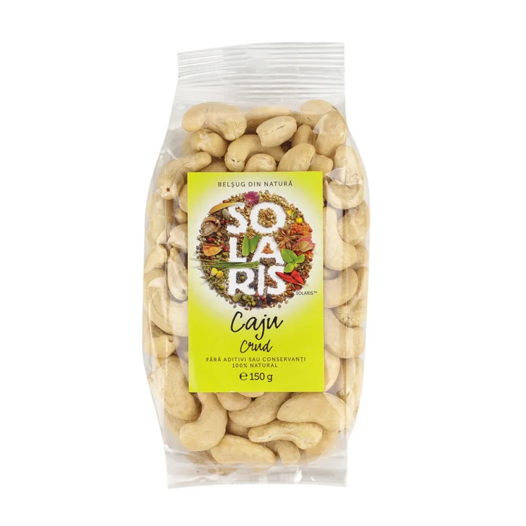 Caju crud, 150 g, Solaris Nucile de caju au un conținut bogat în lipide nesaturate (acizi grași omega 6, 9, 3), magneziu și potasiu, care ajută la reducerea tensiunii arteriale și la prevenirea bolilor de inimă. Conțin fosfor și cupru, minerale benefice pentru fotifierea dinților și oaselor. Alte beneficii ale caju:îmbunătățesc funcționarea sistemului nervos, reduc apariția migrenelor, au acțiune antioxidantă. Caju este ideal în perioadele de post și în alimentația vegană. Poate fi folosit pentru a pregăti deserturi și „lactate” vegane gustoase (lapte de caju, brânză de caju, unt sau smântână de caju).