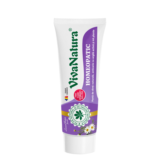 Pasta de dinti cu argila si 44 plante fără fluor Homeopatic-este o pastă de dinți 99,7% naturală, ideală pentru îngrijirea dinților, ce poate fi utilizată cu succes în timpul tratamentelor homeopatice, când majoritatea pastelor de dinți sunt interzise;