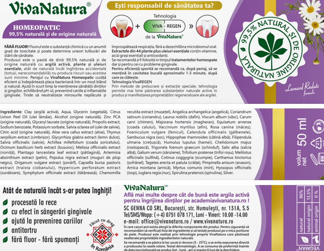 Pastă de dinți Homeopatic are o componentă complexă din plante, argila activă, propolis și aloe vera, care previn apariția cariilor și a formării tartrului; are o aromă plăcută, revigoranță datorită conținutului de ulei volatil de lămâie; nu conține fluor și nu formează spumă;