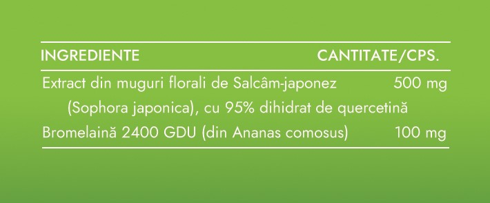 Ingrediente: extract din muguri florali de Salcâm Japonez (Sophora japonica), cu 95% dihidrat de quercitina; capsulă: hidroxipropilmetilceluloza; bromelaina; agenți antiaglomeranti: săruri de magneziu ale acizilor grași vegetali, dioxid de siliciu.
