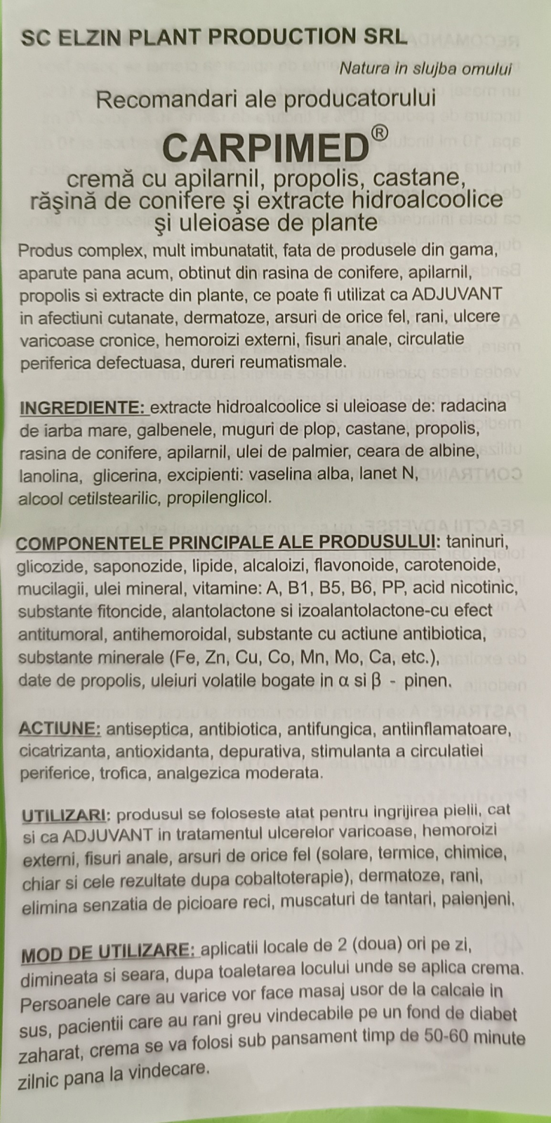 Produs complex, mult imbunatatit, fata de produsele din gama, aparute pana acum, obtinut din rasina de conifere, apilarnil, propolis si extracte din plante, ce poate fi utilizat ca ADJUVANT in afectiuni cutanate, dermatoze, arsuri de orice fel, rani, ulcere varicoase cronice, hemoroizi externi, fisuri anale, circulatie periferica defectuasa, dureri reumatismale.