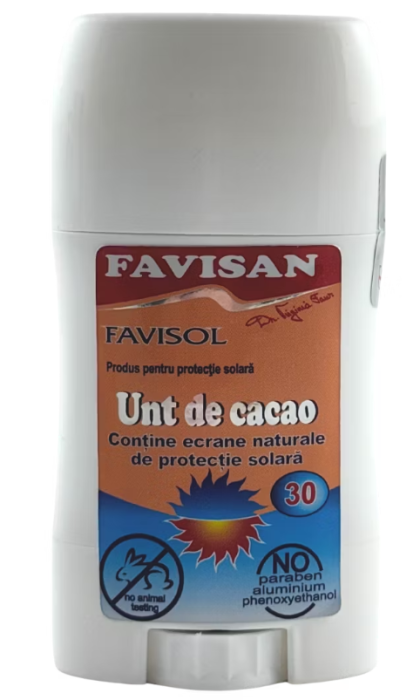 Unt de Cacao FPS 30 Favisol Favisan, 60 g: produs de ingrijire a pielii in timpul expunerii la soare, cu FPS 30 si o formula imbogatita cu unt de cacao cu excelente proprietati de hranire a tesuturilor, fiind un factor natural de protectie UV.