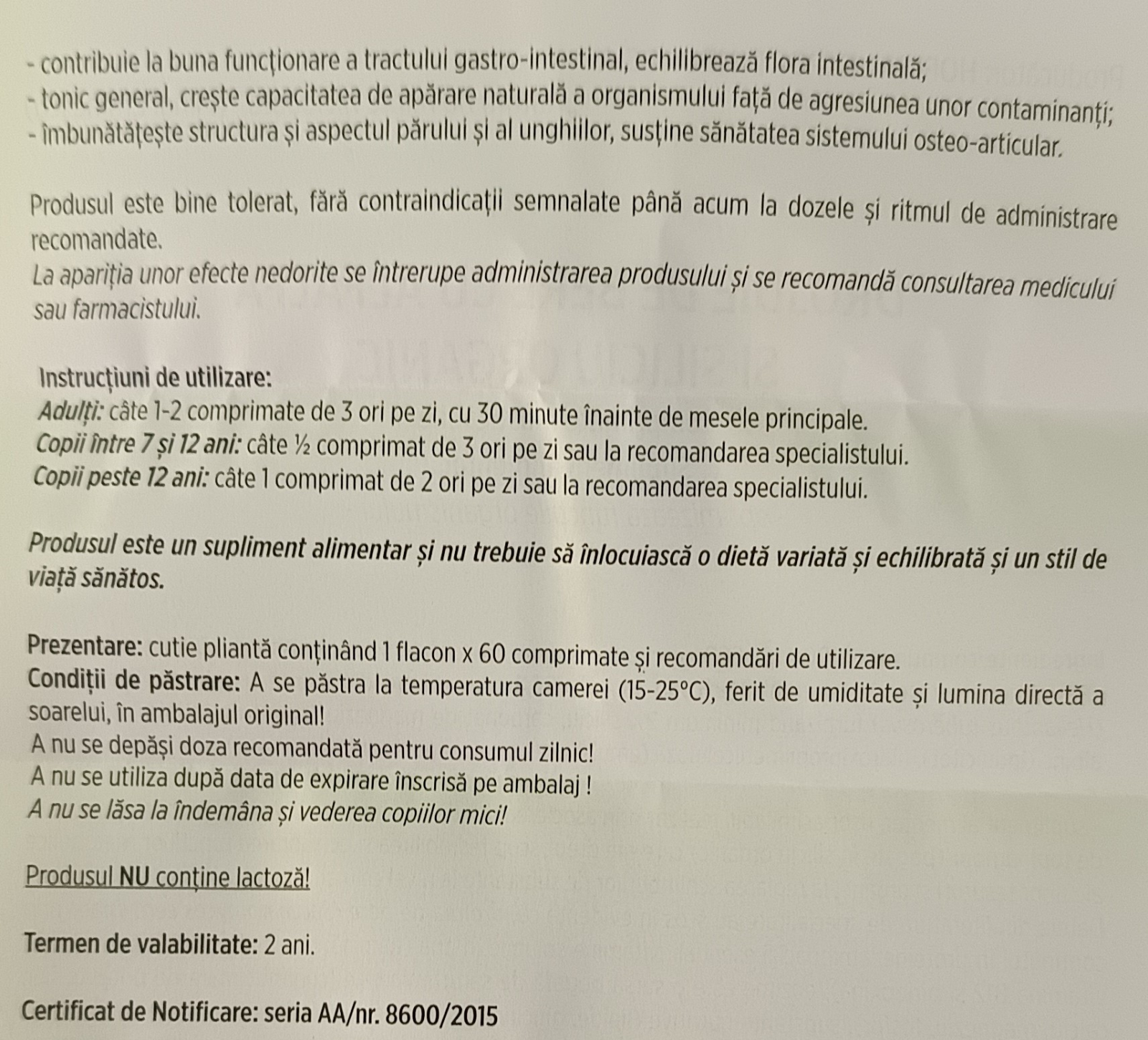 - ca sursa bogata de siliciu organic si calciu promoveaza sanatatea sistemului osteo-articular si favorizeaza cresterea densitatii osoase, amelioreaza diminuarea progresiva a fragilitatii osoase;