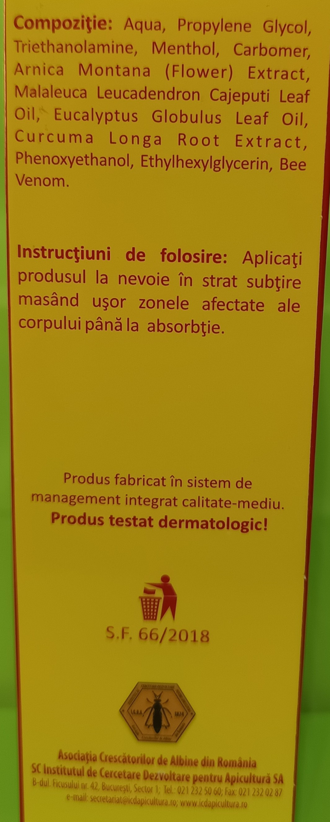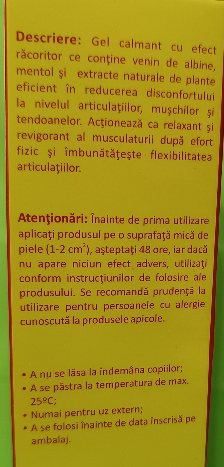 Gel calmant cu efect răcoritor ce conține venin de albine, mentol și extracte naturale de plante eficient în reducerea disconfortului la nivelul articulațiilor, mușchilor și tendoanelor.
