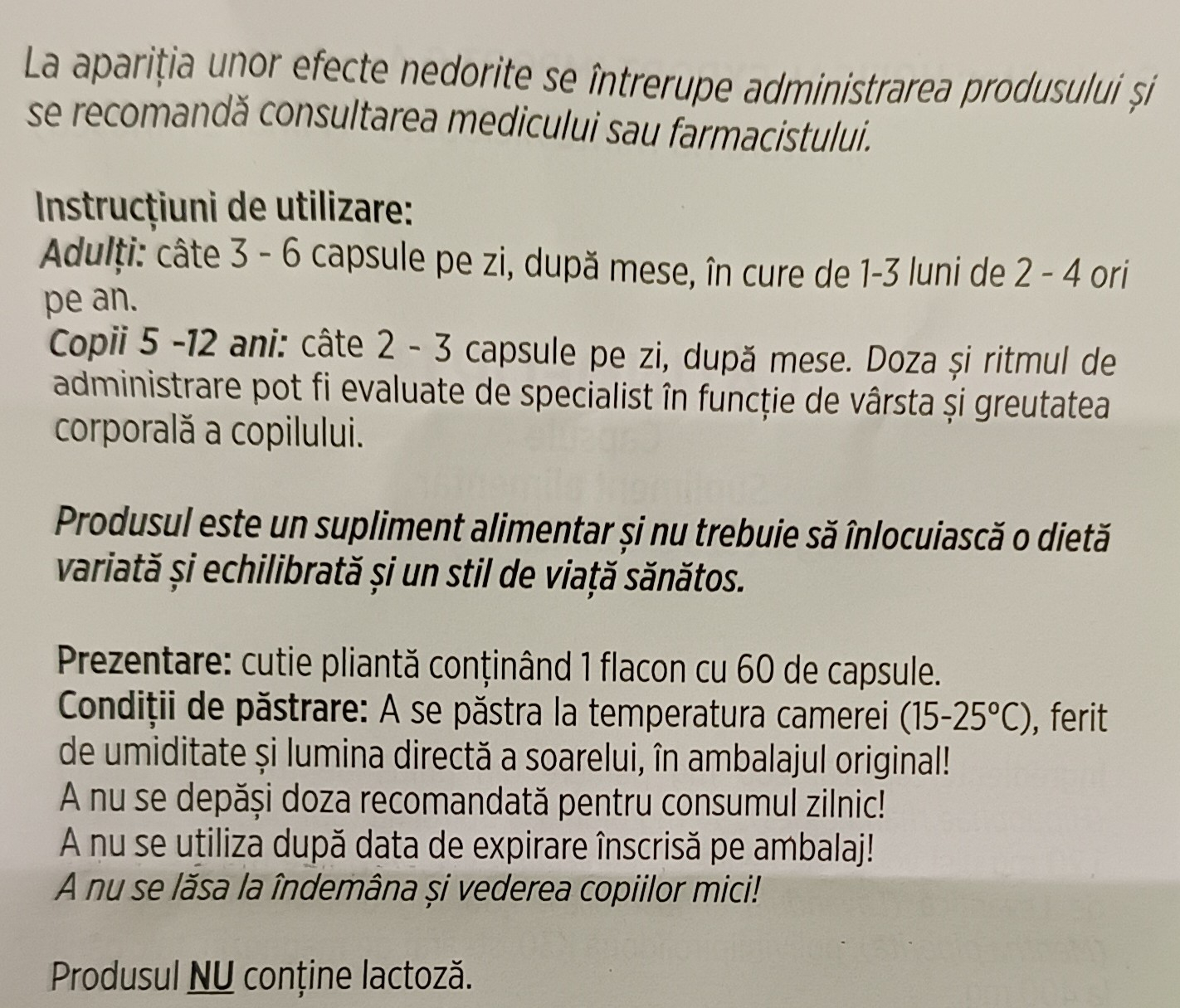 Produsul este un supliment alimentar şi nu trebuie să înlocuiască o dietă variată şi echilibrată şi un stil de viaţă sănătos.