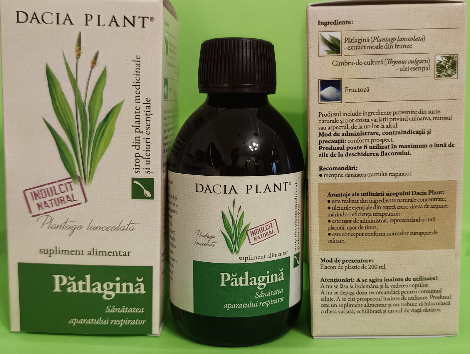 normalizarea secrețiilor bronșice, decongestionarea tractului respirator; Contribuie la: obținerea confortului respirator; menținerea sănătății tractului respirator, umidității mucoaselor bronșice în limite normale; conferă protecție pentru o respirație sănătoasă; concentratie de 90% patlagina; indulcit cu fructoza;