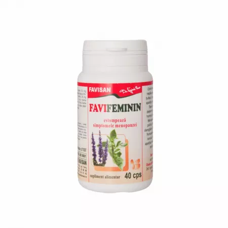 FAVIFEMININ adjuvant in reducerea simptomelor neplacute ale menopauzei (bufeuri, exces de transpiratie, aparitia tesutului adipos si flasc etc), determinate de insuficienta hormonilor sexuali feminini.