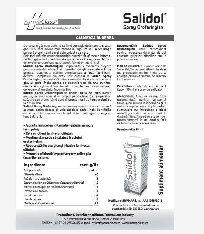 Salidol Spray Orofaringian este un produs indicat pentru ameliorarea durerilor de gât asociate cu răceala, gripa sau iritații faringiene.