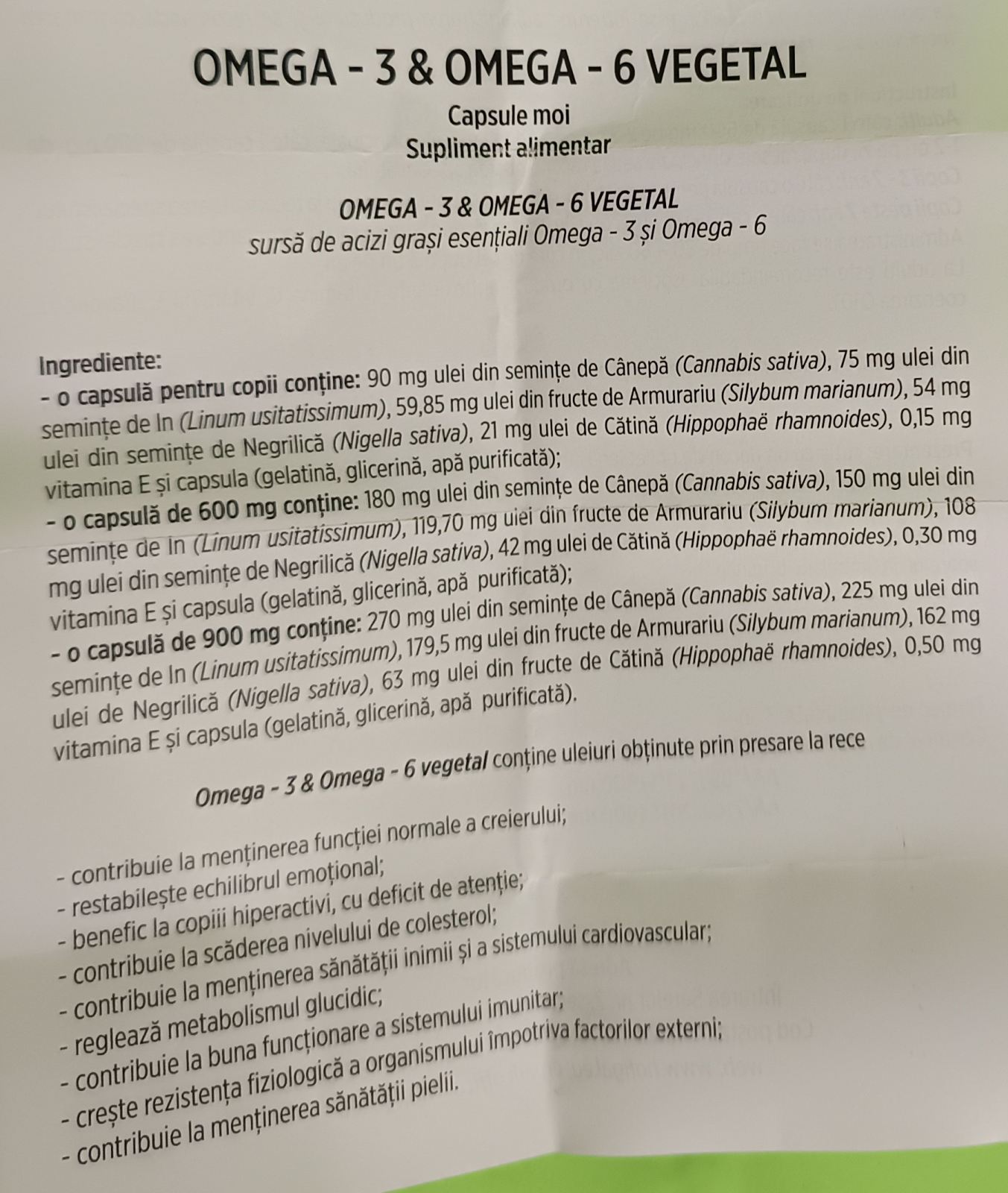 copii de la 3 ani; NU conține lactoză; dezvoltarea creierului, stimulează activitatea funcțională a sistemului nervos; îmbunătățește capacitatea de concentrare, învățare și memorare;benefic în tulburări psihice la copiii cu deficit de atenție, cu dezvoltare mentală și psihomotorie întârziată, în perturbări de comportament;buna funcționare a sistemului imunitar, inclusiv la persoanele aflate sub tratament oncologic;reduce nivelul colesterolului și trigliceridelor din sânge și reechilibrează raportul dintre colesterolul rău (LDL) și colesterolul bun (HDL);