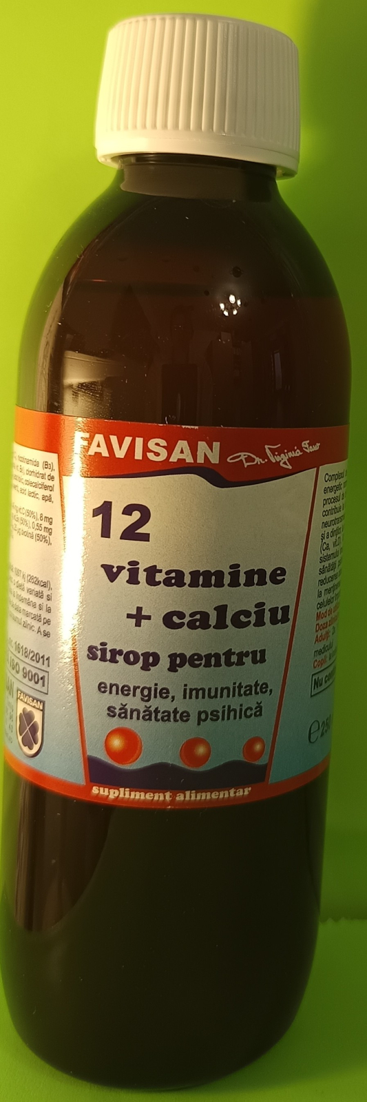 Sirop 12 Vitamine si Calciu, 250 ml produs natural compus din 12 vitamine si Calciu recomandat ca adjuvant in hipovitaminoze si in stari fiziologice in care absorbtia calciului este insuficienta. Siropul contribuie la metabolismul energetic normal, la procesul de diviziune celulara, functionarea normala a enzimelor digestive, mentine sanatatea sistemului osos si a dintilor, mentine functia normala a sistemului muscular, protejeaza celulele impotriva stresului oxidativ.