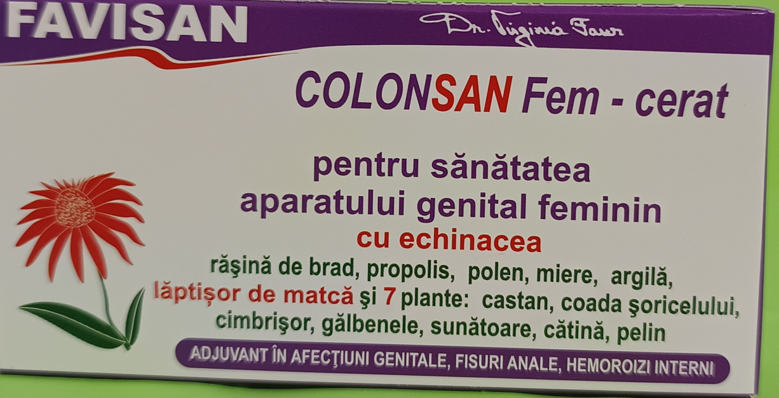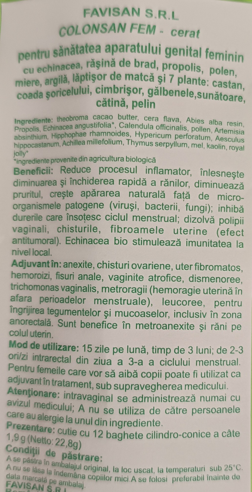 Pentru sănătatea aparatului genital feminin, cu răşină de brad, propolis, polen, miere, argilă, lăptişor de matcă şi 5 plante: gălbenele, sunătoare, cătină, pelin, urzică.