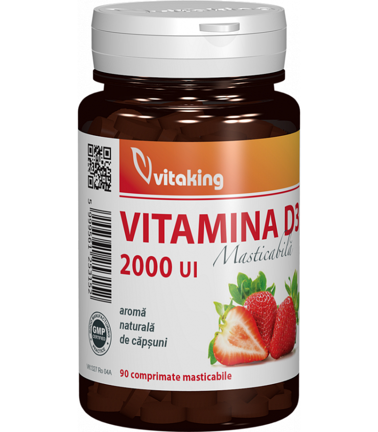 Vitamina D3 2000 UI, comprimate masticabile cu gust delicios de capsuni, apreciata de copii; Produs fara zahar, indulcit cu stevie; Suport esențial pentru oase, imunitate și sănătate generală; funcționarea normală a sistemului imunitar; menținerea sănătății oaselor, dintilor, funcțiile neuromusculare, reducerea inflamatiilor; ajuta la creșterea și dezvoltarea normală a organismului;